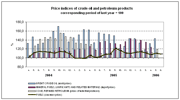 Price increase slowed down also in ‘transport‘, especially due to price development of automotive fuels; their prices increased rather markedly in the Q2 2006 (average month-on-month growth rate was 2.8%); however, in the Q2 2005 the increase was faster (average m-o-m growth rate of 3.6%). It resulted in a slowdown of y-o-y growth rate to 8.6% (from 12.4% in Q1). The slowdown of price growth took place mainly in April and was reflected also in prices of domestic producers of refined petroleum products.