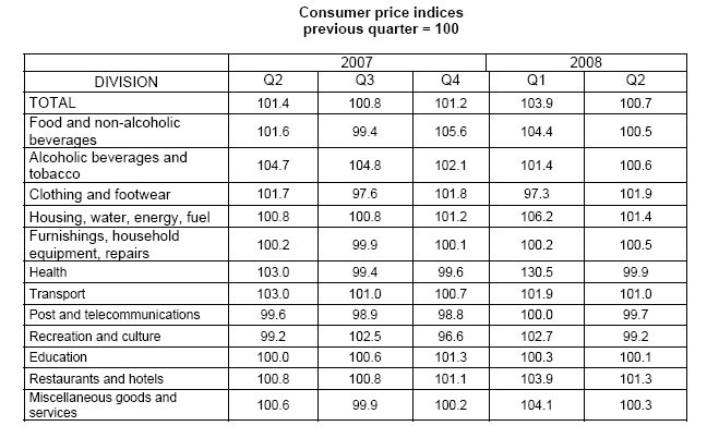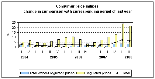 Following a marked increase in Q1 the consumer price development in the next months was stable. Consumer prices grew in Q2 2008 compared with Q1 2008 by 0.7% of which regulated prices increased by 0.9% and market prices by 0.7%.