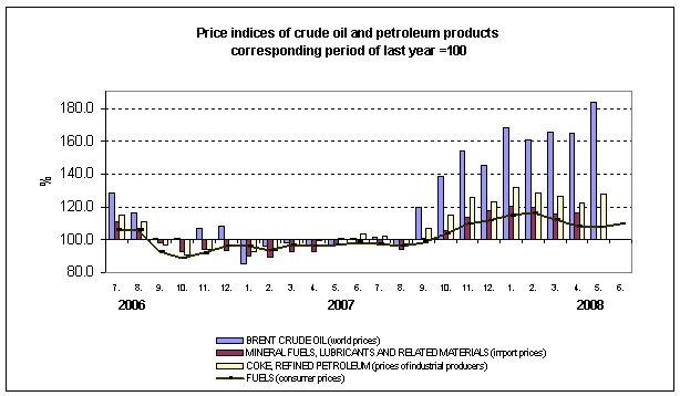 Development of consumer prices of fuel like import prices of mineral fuels and industrial producer prices of refined petroleum products responded to soaring world oil prices. Strengthening of the CZK exchange rate against USD had a favourable impact on fuel prices.