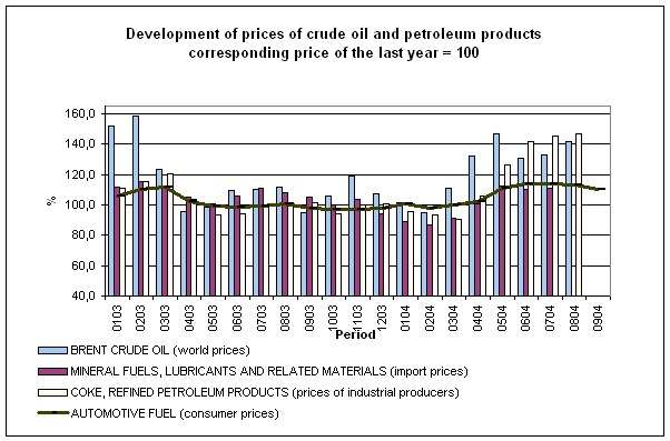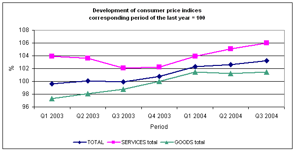 Prices of goods, total increased by 1.5%, prices of services by 6.0%. Price growth of services was influenced especially by the VAT increase since May 2004, which was reflected in all the three months of the third quarter (unlike the second quarter). Prices of goods, total increased mainly in July and August due to the price increase especially at food and automotive fuel.