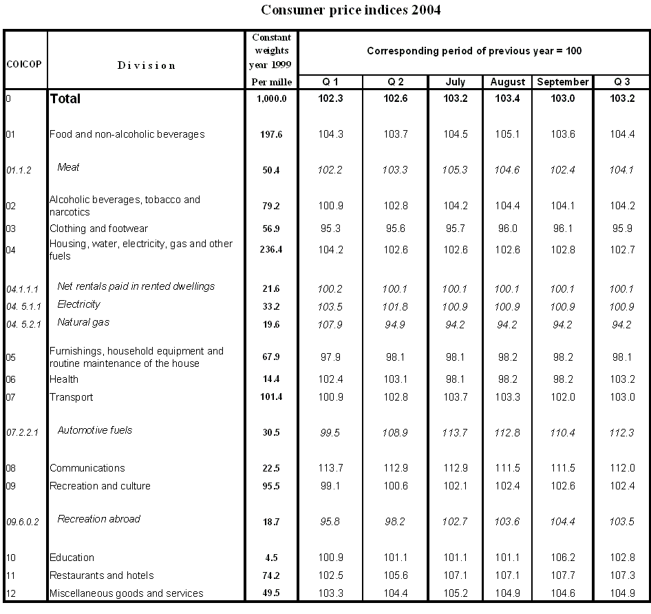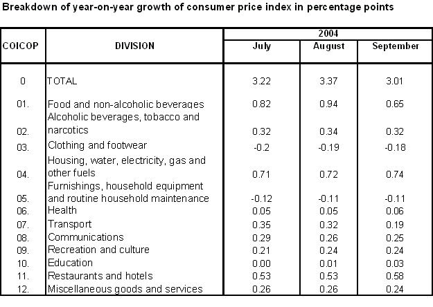 Consumer prices level increased in the third quarter of 2004 by 3.2% y-o-y , which is by 0.6 percentual point more than in the second quarter of 2004 and the most for the last two and half years (since the first quarter of 2002). The price growth acceleration, although in the different scope, occurred at all COICOP divisions of the consumer basket with the exception of ‘post and telecommunication’. The biggest contributors to the growth acceleration of the overall price level were (with regards to their weight in the consumer basket) prices of food and non-alcoholic beverages and also prices in ‘alcoholic beverages, tobacco‘, ‘recreation and culture’, ‘education’, and ‘restaurants and hotels’.