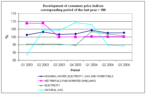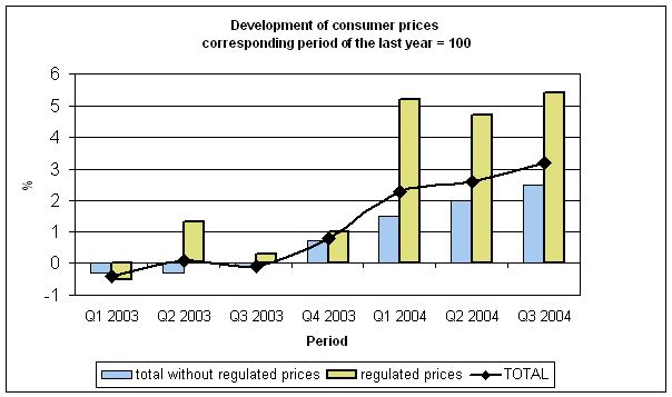 Market prices and regulated prices participated in the total increment of consumer prices in the third quarter of 2004 with 1.9 and 1.3 percentual points, respectively. Market prices increased by 2.5% (in the second quarter by 2.0%), regulated prices by +5.4% (in the second quarter +4.7%).