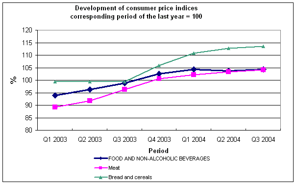 Prices of food and non-alcoholic beverages during all months of the third quarter were decreasing m-o-m due to seasonal price decrease of fruit, vegetables and potatoes; however, this decrease was less marked than in 2003 with the exception of September. That resulted in acceleration of y-o-y dynamics of price growth in July and August. In these two months, also price increase of meat and sugar influenced the price increase of food. In September, food price growth slowed down as (unlike in the last year) seasonal prices of food continued to decrease and growth of meat prices stopped. In the third quarter, prices of bread and cereals were higher y-o-y by 13.6% (prices of rolls and bagels increased by 32.7%), meat by 4.1% (pork +10.2%), milk, cheese, and eggs in average +3.9%, oils and fats +5.2%, fruit +5.1%, and sugar +40.7%. Lower were especially prices of fresh vegetables (-8.9%) and potatoes (-24.9%).