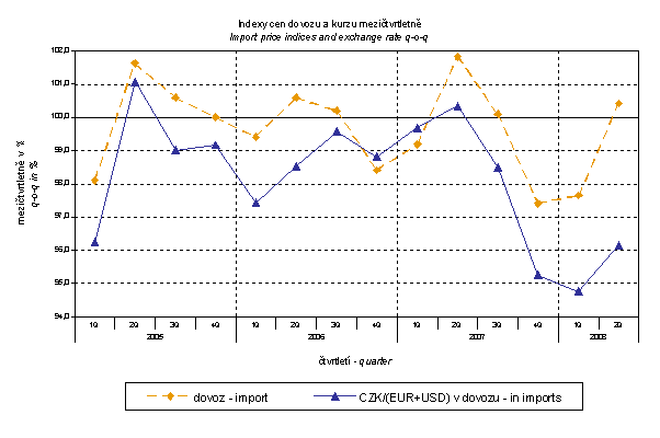 The graphs clearly show that more moderate strengthening of CZK in Q2 2008 resulted in more moderate drop of price indices and even a modest rise of the import price index.