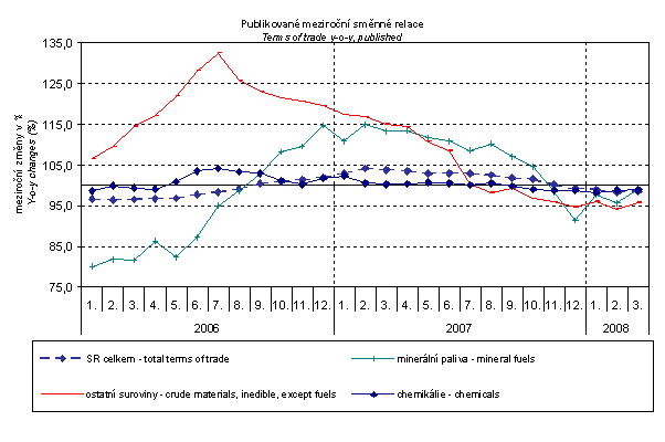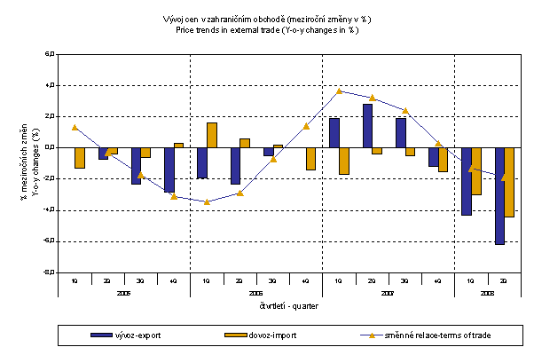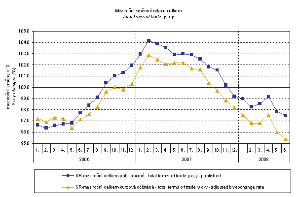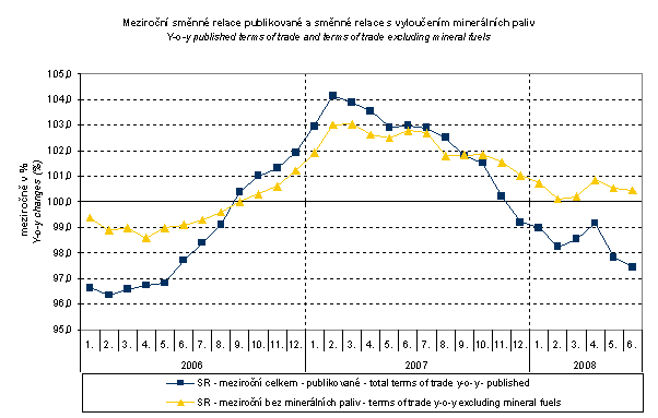 Terms of trade reached in Q2 2008 y-o-y the value of 98.1 % (i.e. by 0.6 p.p. less than in Q1 2008). Y-o-y terms of trade resumed negative values for the second quarter – see graph below. The lowest value was recorded in 'mineral fuels, lubricants and related materials', 95.2 %. Slightly negative terms of trade values were reached in 'chemicals and related products' 99.6% and in 'miscellaneous manufactured articles' 99.9%. However, positive values were reached almost in all groups, among groups important in terms of weight positive values were recorded in 'machinery and transport equipment' 101.3% and in 'manufactured goods classified chiefly by material'' 100.7%.