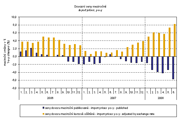 Import prices decreased in Q2 2008 by 4.4 % (in Q1 2008 by 3.0 %). The price drop was attributed especially also to a strong CZK exchange rate. The biggest price drops were recorded in 'machinery and transport equipment' by 10.2% (mainly electrical and optical equipment), 'miscellaneous manufactured articles' by 8.1%, 'chemicals and related products' by 7.2% and in 'manufactured goods classified chiefly by material' by 5.9%. Among groups important in terms of weight increasing prices were recorded only in 'mineral fuels, lubricants and related materials' by 21.9% (mainly petroleum and petroleum products), 'crude materials, inedible, except fuels' by 2.9% and in 'food, beverages and tobacco' by 0.2%.