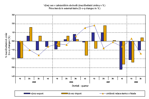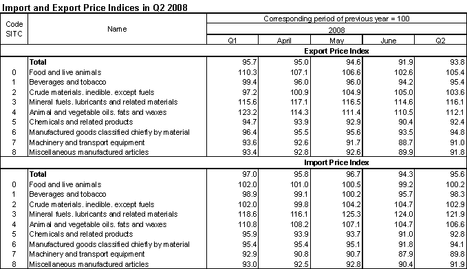 Export prices Q2 2008 compared to Q1 2008 decreased by 1.0% (in Q1 2008 by 2.1%). Import prices increased by 0.4 % (in Q1 -2.4%).