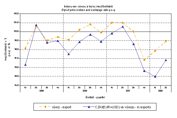 The q-o-q exchange rate index includes two most important currencies from the aspect of the Czech external trade, i.e. EUR and USD; q-o-q indices of CZK exchange rates to these currencies were weighted by the weight which pertains to those currencies in the export price index.
