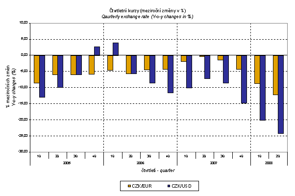 Beginning from Q4 2007 different price development was balanced again. As it was shown above, external trade prices are exposed to many effects, among other things, also to the CZK exchange rate to foreign currencies. This influence is important and often even decisive mainly in m-o-m expression; however, it is very significant in q-o-q comparison and markedly affects also the level of the year-on-year external trade price indices. In the last as well as in this quarter the CZK exchange rate recorded an exceptional growth which corresponds with low values of external trade price indices. The development of quarterly y-o-y changes of exchange rates is clear from the graph below.
