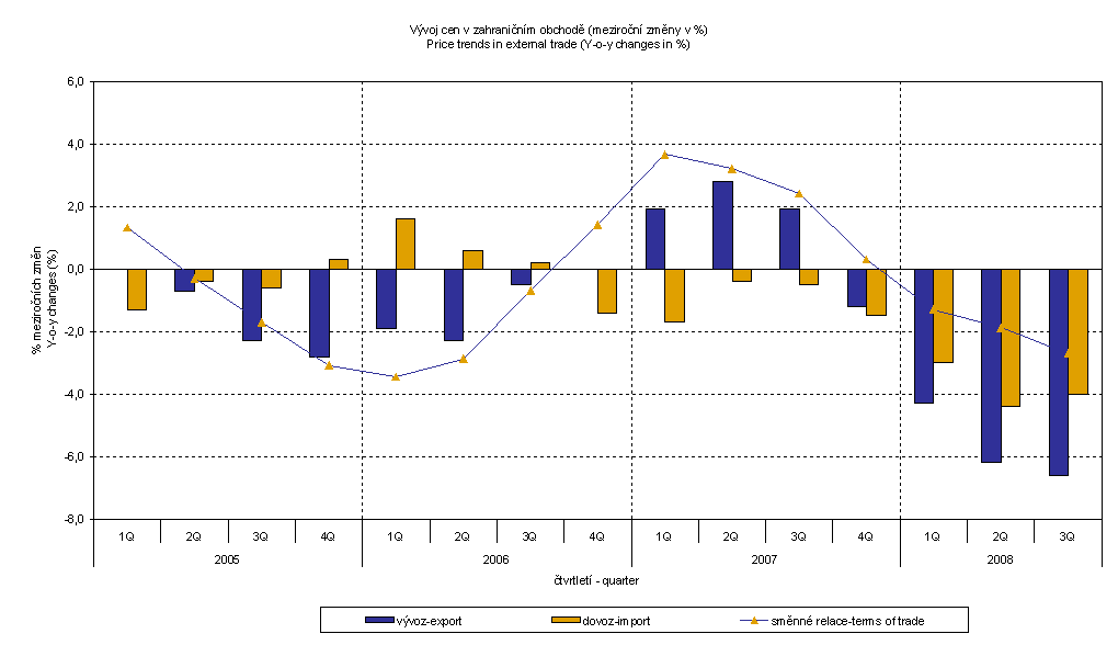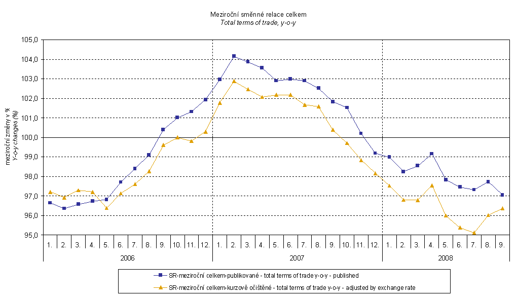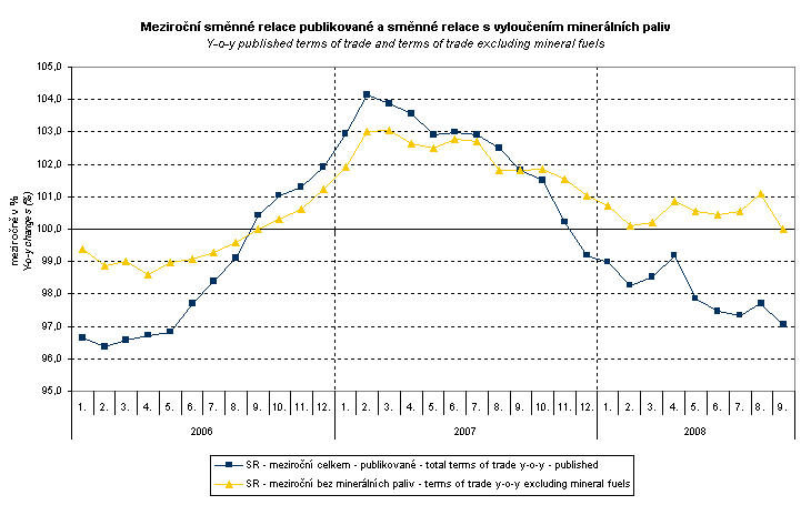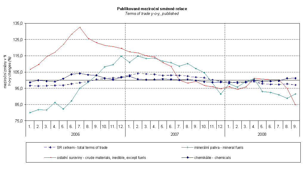 Terms of trade reached in Q3 2008 y-o-y the value of 97.3 % (i.e. by 0.8 p.p. less than in Q2 2008) and in Q3 they remained in negative values – see graph below. The lowest value was recorded in 'mineral fuels, lubricants and related materials', 90.5 %. Among groups important in terms of weight negative terms of trade values ware recorded in 'crude materials, inedible, except fuels' 93.0%, 'food, beverages and tobacco' 95.7% and 'miscellaneous manufactured articles' 99.2%. In contrast, positive terms of trade values were recorded for 'manufactured goods classified chiefly by material'' 104.3%, 'machinery and transport equipment' 101.2% and 'chemicals and related products' 100.6%.