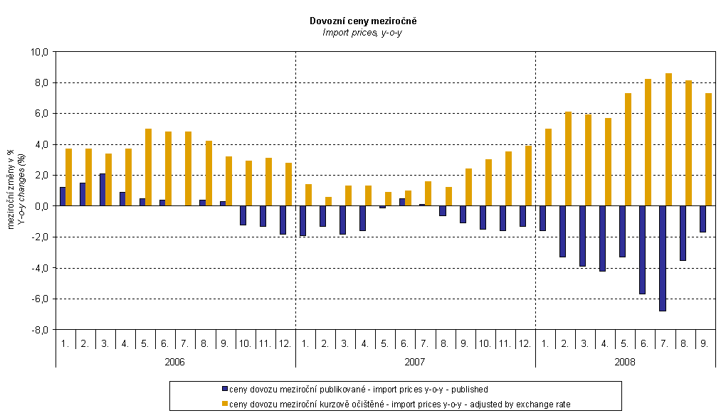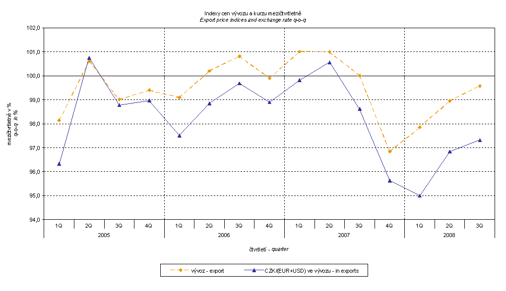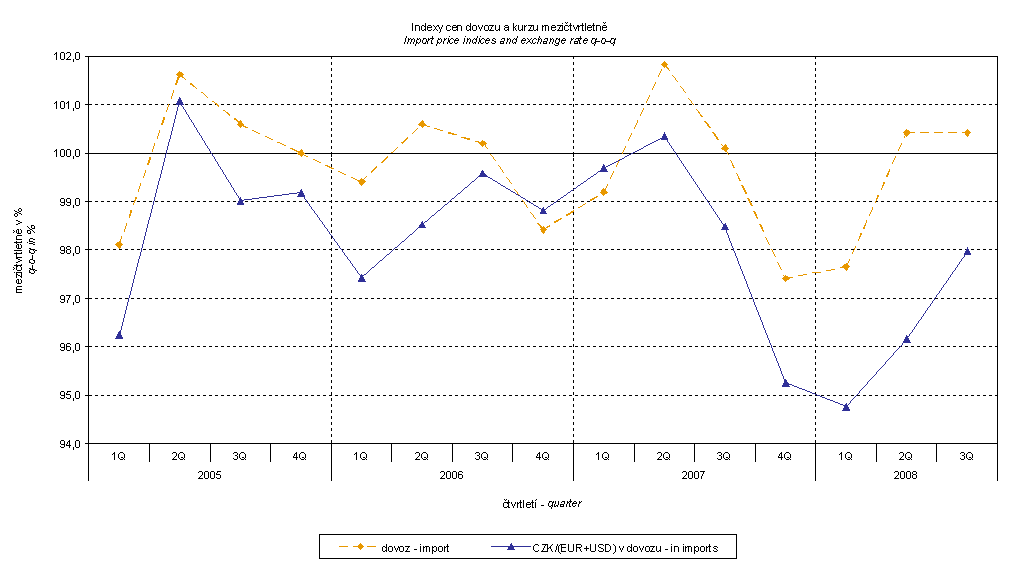 The graphs clearly show that slower growth rate of strengthening of CZK to EUR and moderate weakening of USD in Q3 2008 resulted in more moderate drop of export price indices and even a slight rise of the import price index.