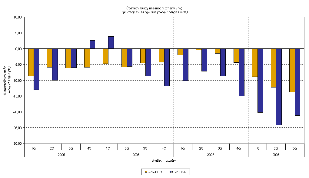 Beginning from Q4 2007 different price development was balanced again. As it was shown above, external trade prices are exposed to many effects, among other things, also to the CZK exchange rate to foreign currencies. This influence is important and often even decisive mainly in m-o-m expression; however, it is very significant in q-o-q comparison and markedly affects also the level of the year-on-year external trade price indices. In the last as well as in this quarter the CZK exchange rate recorded an exceptional growth, which corresponds with low values of external trade price indices. The development of quarterly y-o-y changes of exchange rates is clear from the graph below.