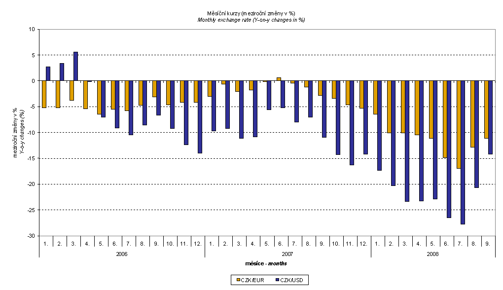 It is clear from the above graph that in the period from January 2006 to April 2006 the exchange rate influence decreased y-o-y terms of trade and from May 2006 the exchange rate influence increased terms of trade. This came from the fact that in currency basket the share of USD is bigger in imports than in exports. As it is clear from the graph Monthly Exchange Rates, in the period from January to April 2006 CZK strengthened to EUR and, at the same time, mostly weakened to USD. The graph also shows that even after the exchange rate influence elimination terms of trade would have been growing gradually from May 2006 to February 2007, however, this influence further intensified the growth of the exchange rate. From February 2007 with a little exception in June 2007 terms of trade were decreasing continuously until December 2007 when for the first time after sixteen months they reached negative values. In March and April 2008 terms of trade began to grow, however, from May they began to fall lower into negative values. In August 2008 the terms of trade slightly increased but in September they dropped again due to the exchange rate.
