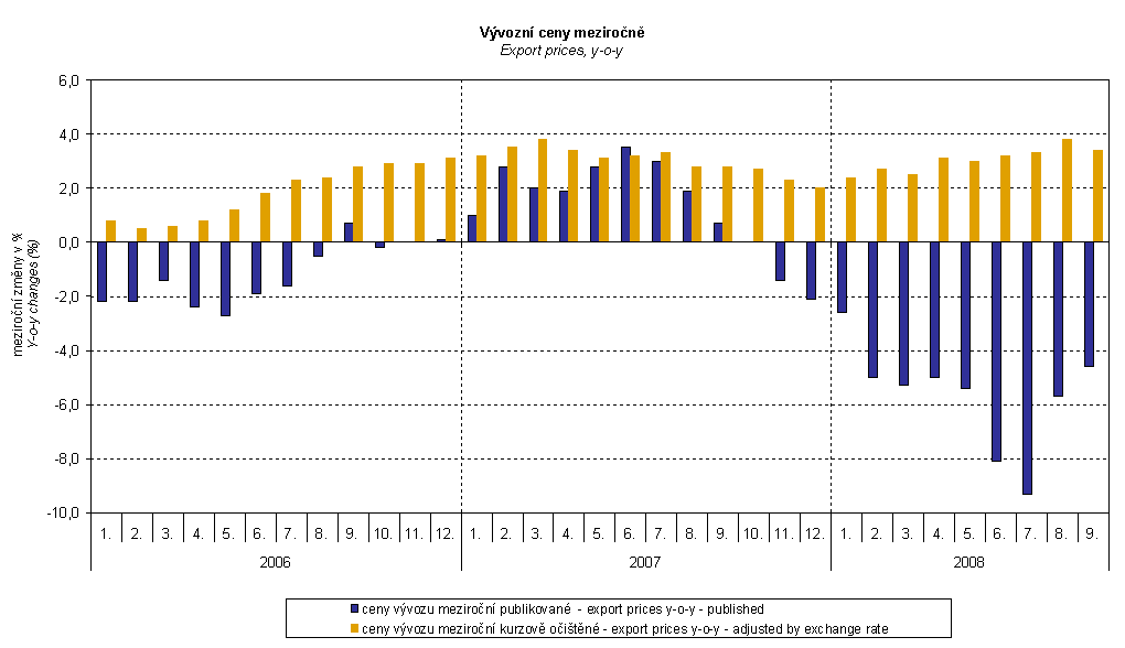 It is clear from the graph that the exchange rate was important also for export price indices. For the whole observed period except for June 2007 it decreased their amount (CZK was mostly strengthening to foreign currencies). In June 2007 the exchange rate increased the index due to weakening of CZK to EUR. After elimination of the exchange rate influence, export prices would have been increasing in all months in the period 2006 to 2008. In 2008 and especially in the last month it is obvious how the strong exchange rate impacted the export price decrease.