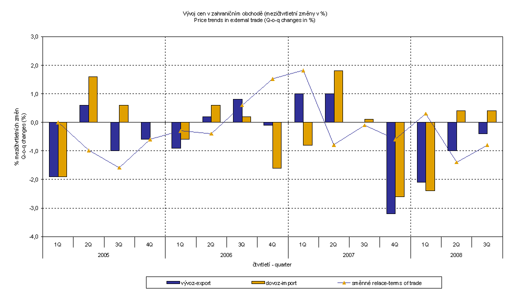 Export prices Q3 2008 compared to Q2 2008 decreased by 0.4% (in Q2 2008 by 1.0%). Import prices increased by 0.4 % (in Q2 also by 0.4%).