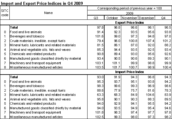 Export prices Q4 2009 compared to Q3 2009 increased by 1.0% (in Q3 -3.7%). Import prices increased by 1.2 % (in Q3 –3.8%).