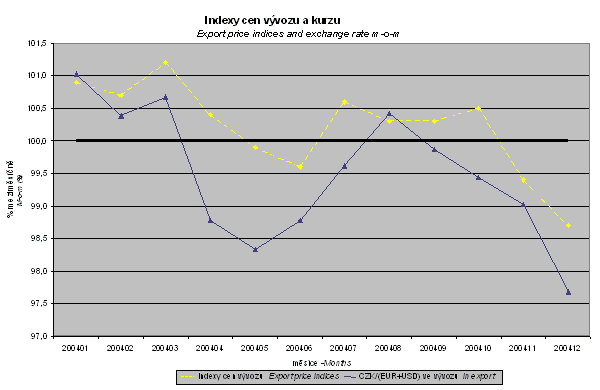 External trade prices in the fourth quarter were increasing y-o-y, however, their growth was gradually decreasing in individual months. This development was conditioned by strengthening of CZK to main foreign currencies as well as by the development of world prices, especially of petroleum and metals. Y-o-y price index of petroleum Brent was decreasing from 170.3% in October 2004 to 155.0% in November and down to 135.8% in December. Total y-o-y price index of metals on world markets fell from 132.0% to 128.5% and down to 121.5%.