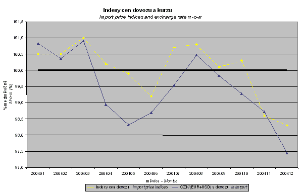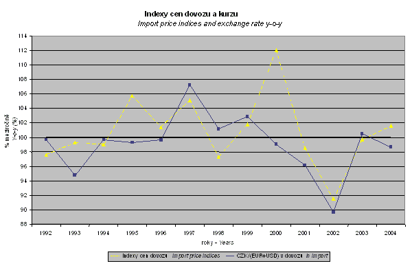 The m-o-m exchange rate index includes two most significant currencies as for the Czech external trade, i.e. EUR and USD; m-o-m exchange rate indices of CZK against these currencies were weighted by the weight pertaining to those foreign currencies in the import price index. The correlation of this total m-o-m import exchange rate index and m-o-m import price index was 0.83 in 2004.