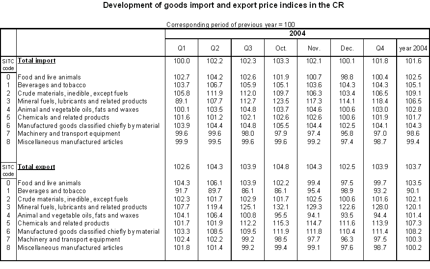 Import prices increased in total by 1.6% y-o-y in 2004, i.e. by 1.9 percentage point more than in 2003. The biggest increase (+9.1%) occurred in prices of ‘crude materials, inedible, except fuels’, especially prices of metalliferous ores in line with the development of prices on world markets. Marked increase was observed also for prices of ‘mineral fuels, lubricants and related materials’ (+6.5%), petroleum, petroleum products and related materials in particular. Prices of this division were also increasing in relation to petroleum price increase on world markets, the correlation reached the value of 0.96. A marked increase (+4.3%) occurred also for prices of ‘manufactured goods classified chiefly by material’, iron and steel and non-ferrous metals in particular (in relation to price growth of metalliferous ores – correlation 0.84 and 0.63, respectively). From measured sections, decreasing were only prices of ‘machinery and transport equipment’ (-1.4%, telecommunications and sound-recording and reproducing apparatus and equipment in particular) and ‘miscellaneous manufactured articles‘ (-0.6%).
