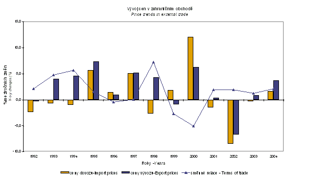 Terms of trade reached positive value of 102.1% y-o-y in the fourth quarter of 2004 (i.e. by 0.5 percentage point more than in the third quarter of 2004). The highest value was in ‘chemicals and related products‘ (111.8%, mainly due to high export prices of organic chemicals and plastics), followed by ‘mineral fuels, lubricants and related materials’ (108.1%, especially due to high export prices of coal) and 'manufactured goods classified chiefly by material' (107.0%, principally due to still high export prices of iron, steel and manufactures of metals). Terms of trade of ‘machinery and transport equipment’ reached the value of 100.5% in the fourth quarter of 2004, i.e. by 0.7 percentage point less than in the preceding quarter. Of the significant sections as for weights, terms of trade reached negative values only for ‘crude materials, inedible, except fuels’ (95.4%) and ‘food and live animals‘ (99.3%).