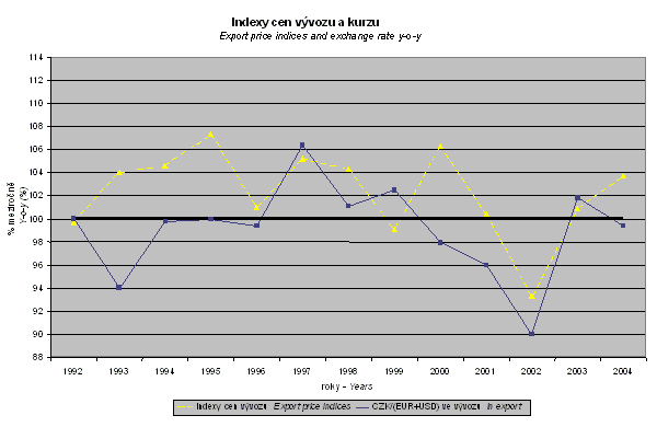 It is clear from the graph that in certain periods (e.g. in 2001 – 2003) exchange rate development rather well corresponded to the development of external trade price indices, while in other periods (recently namely in 2004) it distinctively differed. And indeed, the correlation between individual months of y-o-y exchange rate- and price indices was –0.21 for imports and –0.17 for exports. However, it obviously does not mean that external trade prices grow thanks to the overall stronger CZK; it is just the opposite way – growth of prices (namely world prices of raw materials and food) was so steep that prices of external trade were increasing despite the appreciating CZK, or that the strengthening of CZK was so small that it did not balance the net price growth. It becomes evident that in 2004 both arguments were valid. Influence of prices was above average (especially of world prices in total, petroleum and metals in particular) and overall influence of exchange rate was the smallest since 1996.