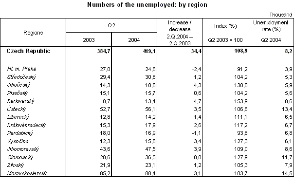 Development of unemployment is sizeably influenced by seasonal effects. Compared to Q1 2004 the number of the unemployed dropped in Q2 2004 by 24.7 thousand persons, the number of job applicants registered by the employment offices decreasing by 32.4 thousand.