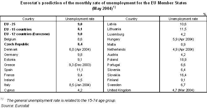 Given for information below is the estimate of the monthly rate of unemployment made by Eurostat for the last known month (May 2004). As in 2003 the rate of unemployment in the Czech Republic is below the average for all 25 EU Member States and is lower than the rates in 13 EU Member States.