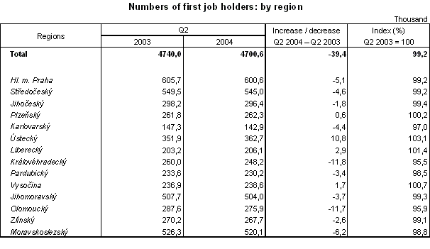 The decrease in the number of the employed and the rising number of the unemployed and the economically inactive produced a drop in the rate of employment (the ratio of the number of first job holders to the number of residents aged 15+) from 55.0 % in Q2 2003 to 54.2 % in Q2 2004. The employment rate had dropped considerably since 1995 (59.0%), in spite of the fact that numerous population cohorts from the mid-1970s entered the labour market. There were large regional differences in this rate, brought about by the number and structure of vacancies in the regions in particular. While there were almost 60 % (59.0 %) of all residents of working and post-working age economically active in Prague, the employment rate in the Olomoucký Region was only 51.2 % and in the Moravskoslezský Region, not even a half of persons aged 15+ were working (49.0%). The employment rate in the other regions ranged between 52.6% (the Ústecký Region) and 57.3% (the Liberecký Region).