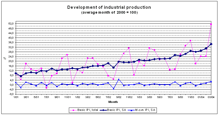 In Q1 2004, the industrial production increased in the following main industrial groupings: consumer durables (+26.0%), intermediate goods (+15.2%), capital goods (+6.3%), consumer non-durables (+3.0%) and energy (+0.6%).