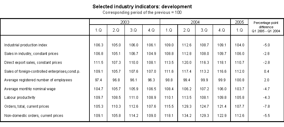 In Q1 2005, sales in industry were higher by 6.0% year-on-year (constant prices), growing most in manufacture of transport equipment (+18.5%), manufacture of electrical and optical equipment (+13.1%) and manufacture of machinery and equipment (+12.5%), They decreased in manufacture of coke and refined petroleum products (-11.0%), mining and quarrying (-8.4%) and manufacture of leather and leather products (-5.4%).