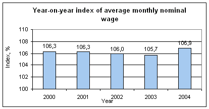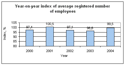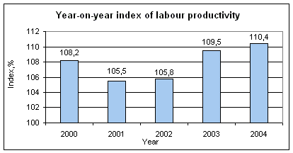 In the year 2004, labour productivity in the industry went up by 10.4%, growing faster than average monthly nominal wage. Unit wage costs dropped by 3.2%.