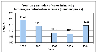 Sales in industry achieved by foreign-controlled enterprises grew by 14.8% at constant prices (17.0% at current prices), and their share in total sales stood at 52.8%. Direct export sales of these enterprises increased by 20.0% (21.6% at current prices) and accounted for 72.8% of total sales.