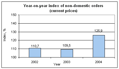 In the year 2004, new non-domestic orders worth CZK 853.3 billion were signed. Their volume was 25.9% up on the year 2003. Increases in the new non-domestic orders were recorded for: