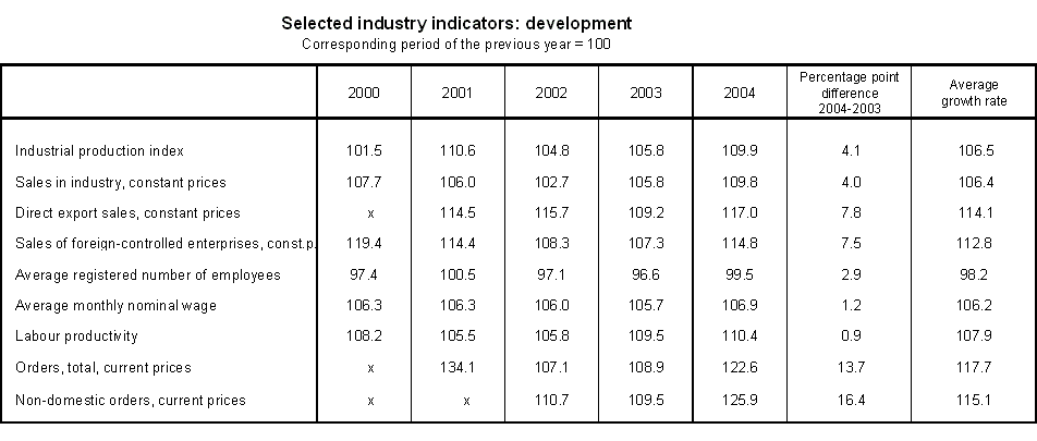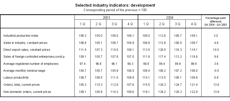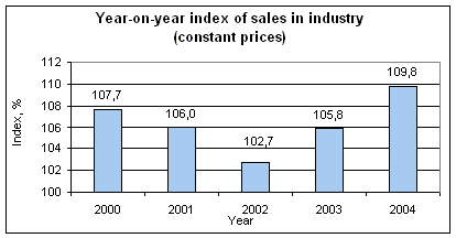 In the year 2004, sales in industry (at constant prices) were higher by 9.8% year-on-year, growing most in manufacture of electrical and optical equipment (+31.4%), manufacture of machinery and equipment (+12.9%), manufacture of transport equipment (+12.4%), and manufacture of rubber and plastic products (+11.8%). They decreased in manufacture of coke and refined petroleum products (-10.5%), mining and quarrying of energy-producing materials (-2.4%), manufacture of food, beverages and tobacco (-1.1%), and manufacture of textile and textile products (-0.6%).