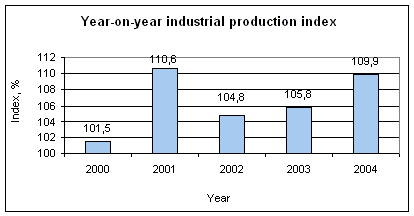 The year-on-year index of industrial production reached 109.9% in the year 2004. The highest growth was recorded in: