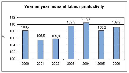 Labour productivity in industry increased by 9.2% in 2006 and grew faster than the average monthly nominal wage (+4.0% in Q1, + 7.6% in Q2, +6.9% in Q3, and +9.0% in Q4). The highest increases in labour productivity were recorded in ‘manufacture of transport equipment’ (+15.5%), ‘manufacture of machinery and equipment’ (+15.2%) and ‘mining and quarrying of energy producing materials’ (+13.4%). Unit wage costs decreased by 2.9%.