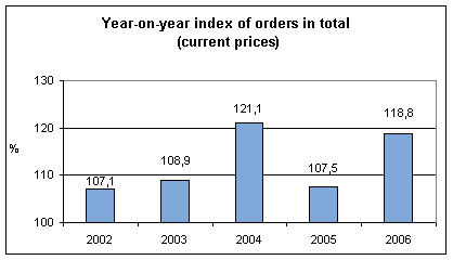 New orders worth CZK 1 720.1 billion were signed in 2006, which was up by 18.8% year-on-year (+23.8% in Q1, +19.9% in Q2, +15.4% in Q3, and +16.1% in Q4). The growth of new orders was most contributed to by ‘manufacture of motor vehicle’ (up by 26.4%, contribution +7.1 p.p.), ‘manufacture of machinery and equipment’ (up by 32.7%, contribution +3.9 p.p.) and ‘manufacture of basic metals and fabricated metal products’ (up by 12.3%, contribution +1.7 p.p.). New orders in total decreased in ‘manufacture of wearing apparel; dressing and dyeing of fur’ (down by 10.0%, contribution -0.1 p.p.) and ‘manufacture of pulp, paper and paper products’ (down by 1.4%, contribution -0.1%).