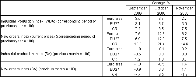 The year-on-year index of industrial production reached 109.7% in 2006 (114.8% in Q1, 108.6% in Q2, 108.0% in Q3, and 107.8% in Q4). The growth of industrial production was most affected by ‘manufacture of transport equipment’ (up by 20.6%, contribution +3.8 p.p. to growth of industry), ‘manufacture of electrical and optical equipment’ (up by 16.3%, contribution +2.1 p.p.) and ‘manufacture of basic metals and fabricated metal products’ (up by 8.9%, contribution +1.2 p.p.). Conversely, industrial production dropped in ‘manufacture of chemicals, chemical products and man-made fibres’ (down by 1.0%, contribution -0.1 p.p.) and ‘manufacture of textiles and textile products‘ (down by 1.7%, contribution -0.1 p.p.).
