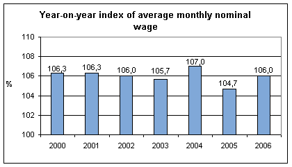 The average monthly nominal wage in industry reached CZK 19 400 in 2006 and was by 6.0% higher year-on-year (+6.4% in Q1, +6.5% in Q2, +5.3% in Q3, and +6.1% in Q4). The highest wage levels (average monthly nominal wage per employee) were registered in ‘manufacture of coke, refined petroleum products and nuclear fuel’, ‘electricity, gas and water supply’ and ‘mining and quarrying of energy producing materials’. The lowest wage levels were in ‘manufacture of leather and leather products’, ‘manufacture of textiles and textile products’ and ‘manufacturing n.e.c.’.