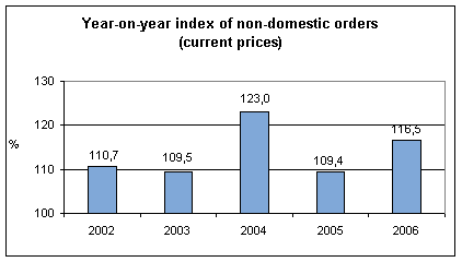 New non-domestic orders worth CZK 1 088.4 billion were signed in 2006, which was by 16.5% more year-on-year (+19.8% in Q1, +12.6% in Q2, +14.6% in Q3, and +18.9% in Q4). The growth of new non-domestic orders was most attributable to ‘manufacture of motor vehicles’ (up by 20.7%, contribution +6.4 p.p.), ‘manufacture of machinery and equipment’ (up by 29.6%, contribution 3.6 p.p.) and ‘manufacture of electrical and optical equipment’ (up by 19.6%, contribution +1.9 p.p.). New non-domestic orders decreased in ‘manufacture of office machinery and computers’ (down by 17.4%, contribution -1.1 p.p.), ‘manufacture of pulp, paper and paper products’ (down by 5.8%, contribution -0.2 p.p.) and ‘manufacture of wearing apparel; dressing and dyeing of fur’ (down by 10.3%, contribution -0.1 p.p.).