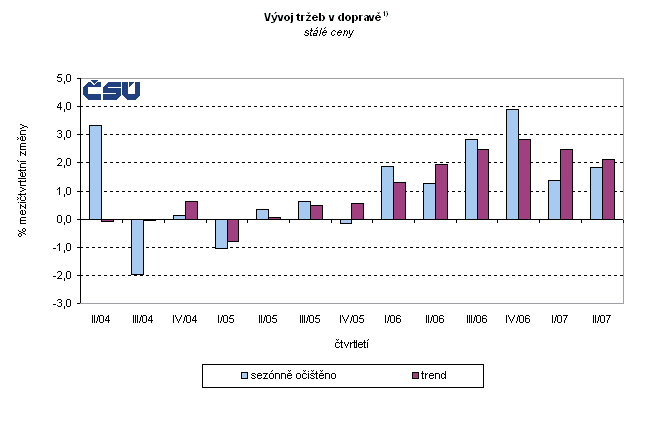 Sezónně očištěné tržby se v odvětví dopravy mezičtvrtletně reálně zvýšily o 1,8 %. Trendová složka za stejné období vzrostla o 2,1 %, což bylo o 0,3 p.b. méně než průměrný růst za předchozí čtyři čtvrtletí (tabulka č. 1).