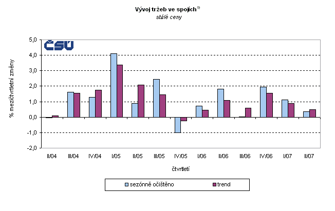 Sezónně očištěné tržby se v odvětví spojů mezičtvrtletně reálně zvýšily o 0,4 %. Trendová složka za stejné období vzrostla o 0,5 %, což bylo o 0,5 p.b.méně než průměrný růst za předchozí čtyři čtvrtletí (tabulka č. 2).