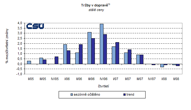 Sezónně očištěné tržby klesly v dopravě ve 2. čtvrtletí 2008 mezičtvrtletně reálně o 0,1 %, Meziročně se zvýšily očištěné i neočištěné tržby shodně o 0,5 %. K celkovému růstu přispěly nejvíce vedlejší a pomocné činnosti v dopravě. Ve spojích tržby po očištění mezičtvrtletně klesly o 1,3 % a meziročně po očištění se zvýšily o 1,1 %, bez očištění o 0,9 %.