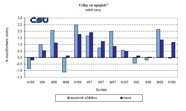 K celkovému růstu přispěly pouze telekomunikace, které jsou jedním z mála odvětví, kde je zaznamenáván nepřetržitý růst od počátku zavedení statistického zjišťování, tj. od r. 1997. Tentokrát se meziročně zvýšily o 2,2 %. Naopak poštovní a kurýrní činnosti ve všech čtvrtletích roku 2008 zaznamenaly pokles tržeb, ve 4. čtvrtletí nejvyšší od zavedení zjišťování.