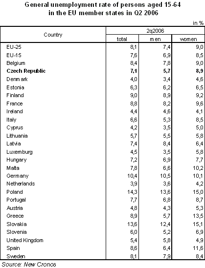 The growth of total employment and the decrease in the number of the unemployed resulted in a relatively high decrease of general unemployment rate of persons aged 15-64 (ILO). In comparison to Q3 2005, the general unemployment rate decreased by 0.8 percentage points to 7.1%. It decreased mainly among the female population (by 1.1 percentage points to 8.8%), while it dropped among the men population by 0.5 percentage points to 5.6%. According to the latest complete results of the Eurostat for Q2 2006 the general unemployment rate in the Czech Republic was lower than in the EU25, when with a relatively low unemployment level of men the level of unemployment of women in the CR was practically the same as the total for all EU member states. The big decrease of unemployment during this year in the Czech Republic has a positive effect in both of the comparisons with the EU25 and EU15 countries when in Q2 2006 the unemployment rate in the CR was lower than the average of the EU15.