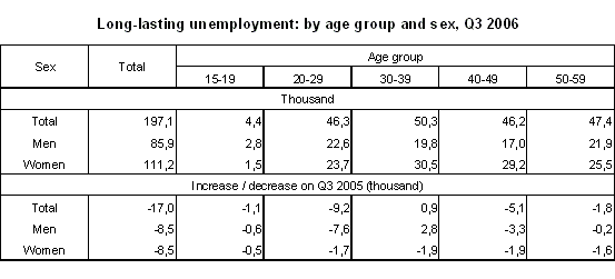 The number of persons unemployed for a long time (1 year or more) fell by 17.0 thousand. In spite of this total drop, a higher increase was recorded among men aged 30-39 (+2.8 thousand), which is connected to a certain extent with a natural shift in the age structure of the population.
