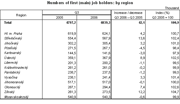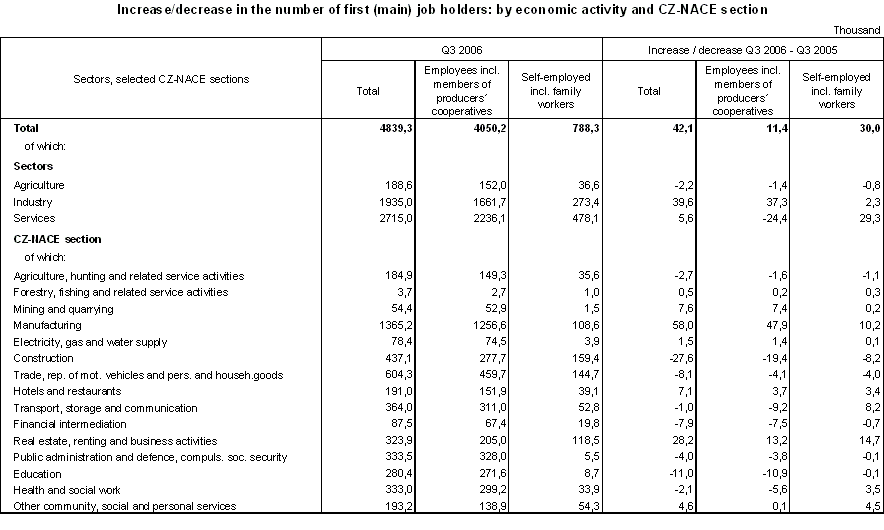 Employment in the primary sector (agriculture, forestry, fishing) decreased by 2.2 thousand to 188.6 thousand persons year-on-year and made up only 3.9% of the total number of first (main) job holders. The number of persons employed in the secondary sector (industry, construction) increased compared to Q3 2005 by 39.6 thousand to 1 935.0 thousand (40.0% of total employment). This growth was mainly affected by the year-on-year increase of 58.0 thousand in employment that occurred in ‘manufacturing’. The number of employed persons went up most in ‘manufacture of parts and accessories for motor vehicles and their engines’ (+27.1 thousand), ‘treatment and coating of metals; general mechanical engineering’ (+16.0 thousand), ’manufacture of basic iron and steel and ferro-alloys’ and ‘manufacture of other wearing apparel and accessories’ (in both cases +6.3 thousand). Decrease in the number of employed in ‘construction’ by 27.6 thousand proved itself most in ‘building of complete constructions or parts thereof’ and ‘building completion’.1)