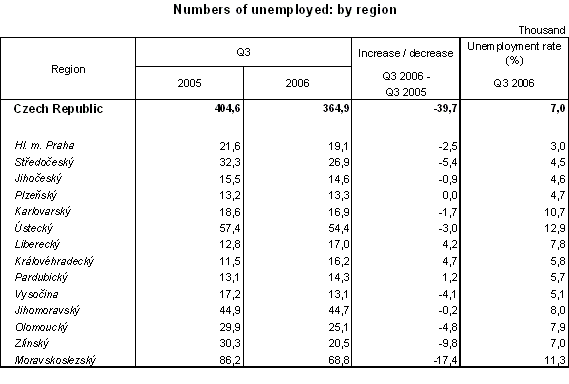 With the growing total employment of the residing population and the economically inactive, the number of the unemployed decreased. The number of unemployed persons (ILO methodology) reached 364.9 thousand on average in Q3 2006, i.e. a fall of 39.7 thousand year-on-year. The number of the unemployed decreased mainly in the age group 25-29 by 12.7 thousand; it also dropped in the age group 35-39 (-6.5 thousand). The number of unemployed men (164.4 thousand in total) is still below the number of unemployed women (200.5 thousand). Under the total year-on-year drop in unemployment, the unemployment of men decreased by 14.5 thousand, and the decrease showed itself in the whole group of 15-54 years old persons, except 30-34-year-old persons. Over the same period, the number of unemployed women decreased by 25.2 thousand in total, and with the exception of the age group 20-24 it dropped in all of the other five years age groups of the productive age.