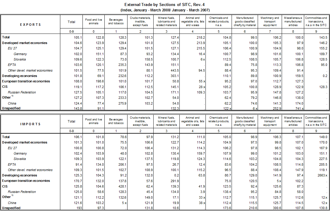 - manufactured goods classified chiefly by material by decreasing exports and imports. The share of these goods in total exports and imports decreased (from 20.8% to 19.7% and from 21.6% to 20.2% respectively). The trade surplus grew insignificantly (CZK +0.6 billion) year-on-year. This improvement was due to deficit decreases in ‘iron and steel’ by CZK 1.7 billion and ‘non-ferrous metals’ by CZK 0.9 billion. The highest surpluses (though lower than in Q1 2007) were concentrated in ‘manufactures of metals’, ‘non-metallic mineral manufactures’ and ‘rubber manufactures, n.e.s.’;