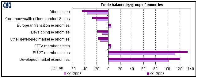- trade surplus with EU27 states grew by CZK 21.2 billion and deficit with the non-EU27 countries rose by CZK 24.7 billion. Trade deficit with the non-EU27 countries was mainly due to the trade deficit with other states that reached CZK 44.3 billion (the rate of coverage of imports by exports was 8.3% in Q1 2008 in comparison to 7.8% in Q1 2007), CIS countries (CZK 27.0 billion), developing economies (CZK 18.9 billion) and other developed market economies (CZK 17.2 billion).